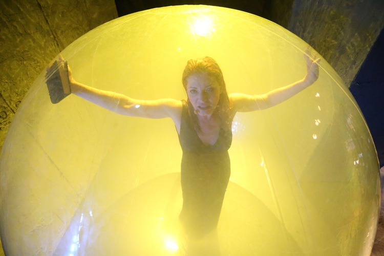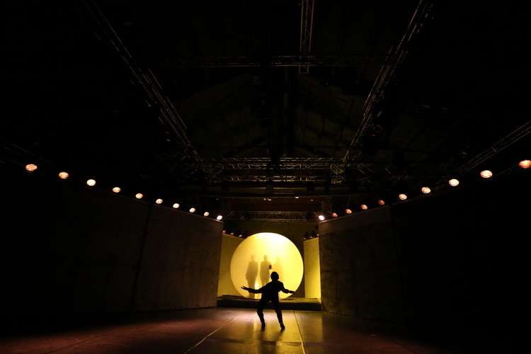 Programul de sală al spectacolului se deschide cu un motto din rugăciunea Shema Israel, din care două versuri rămân adânc prinse de sufletul omului, precum adevărul suprem revelat în ultima clipă a vieții sale: ,,Când sufletul plânge, numai Dumnezeu aude…”, ,,Când inima plânge, timpul se oprește…”. Par cuvinte incrustate, deopotrivă, pe cele două ziduri cenușii dispuse în forma unui triunghi, în interiorul căruia o ființă îmbrăcată într-un costum negru, bărbătesc, cu pantofi și mănuși de aceeași culoare, dar cu cămașă albă, se înclină ritmic, ca într-o rugăciune rostită în fața unui impenetrabil Zid al Plângerii. E un decor-instalație, flexibil, modular, adaptat jocului și schimbului de perspective, de la panoramarea în adâncime până la finele detalii din prim-plan, alternând deschiderile/închiderile dintre lumi, provocate de agitatul peisaj sufletesc al Femeii. Când porțile se deschid, pe fundal apar primii mesageri, închiși într-un uriaș glob galben, translucid, mimând prin coloritul său o lumină artificială, în contrast cu întunericul ce învăluie toate unghiurile scenice. Într-una din secvențele finale, în același glob o vom descoperi pe Ea, prizonieră a propriilor disperări și neliniști ontologice.