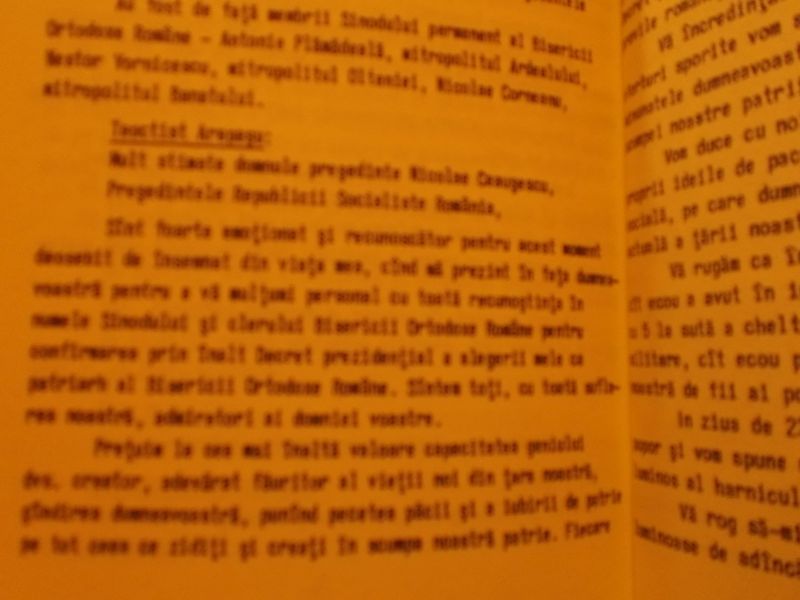 E din 14 noiembrie 1986 – şi acest an, ca şi mulţi alţii, fiind, de fapt, tot un fel de „1984” în sens orwellian. Ceauşescu este, şi aici, se subînţelege, maestru de ceremonii. Umili, de regulă tăcuţi, în genunchi aproape, nume de asemenea grele în epocă: Teoctist Arăpaşu, Manea Mănescu, Ion Cumpănaşu, Antonie Plămădeală, Nestor Vornicescu, Nicolae Corneanu. Cîţiva dintre ei, numele grele şi după 1989. Dacă este să aleg un citat relevant sub care stă această întîlnire pe care o consemnează stenograma în discuţie, cred că este greu de găsit un altul mai potrivit decît vorbele spuse de Teoctist Arăpaşu: „preţuim la cea mai înaltă valoare capacitatea geniului dvs creator, adevărat făuritor al vieţii noidin ţara noastră, gîndirea dumneavoastră, punînd pecetea păcii şi a iubirii de patrie pe tot ce zidiţi şi creaţi în scumpa noastră patrie. Fiecare nouă zidire, fiecare lăcaş, fiecare izvor de lumină şi viaţă poartă pecetea gîndirii dumneavoastră geniale, a dragostei faţă de popor şi de ţară, poartă pecetea păcii a cărei vocaţie o transmiteţi cu toată dăruirea şi atîta hărnicie în această epocă pe care o trăim cu toţii şi pe care, pe bună dreptate, o numim „epoca Ceauşescu”. Făcînd parte din această epocă, noi sprijinim înfăptuirea ei”.