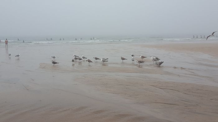 Și Atlanticul din prima zi nu a semănat defel cu celălalt, din ziua a șasea. În prima zi, ceață. Nu se vedea nimic, nici la doi metri distanță. Oceanul se ascundea sub o cortină gri, pâcloasă, de aer cald, de nisip fin, hainele se umezeau instantaneu, părul părea proaspăt spălat. Atlanticul e cu mister. Ca orice ocean, ca orice apă, te ademenește. Te cheamă mai aproape, tot mai aproape. N-ai cum să nu-l testezi, e rece ca un sloi de gheață. Privesc fotografiile din prima zi. Peisajul e selenar. Un pictor priceput a șters cu blândețe contururile. Rămân, în prim-plan, personajele, stinghere, cu haine care țipă la cameră. Pescărușii se confundă cu nisipul, stau ciorchine pe colțuri de stânci. E atâta calm pe plaja Matosinhos, răsturnat peste pături din care țâșnesc temerarii în costume de baie sau surferii, cu placa subsuoară. Orașul de pescari se mândrește cu Castelo do Queijo (sau Castelul de brânză), care desparte sobru fâșiile de plajă și oferă o panoramă unică asupra imensității oceanului. Urcăm pe faleză. Restaurantele stau înșiruite paralel cu malul. Ne oprim. Mâncăm pește. Din nou, bacalhau. Servit, de astă dată, cu cartofi noi, fierți în coajă și rondele de lămâie. La o masă mică, ascultăm valurile cum se sparg de stânci. Briza oceanului. În depărtare, pe dig, pescarii se agață de undițe, în nemișcare.