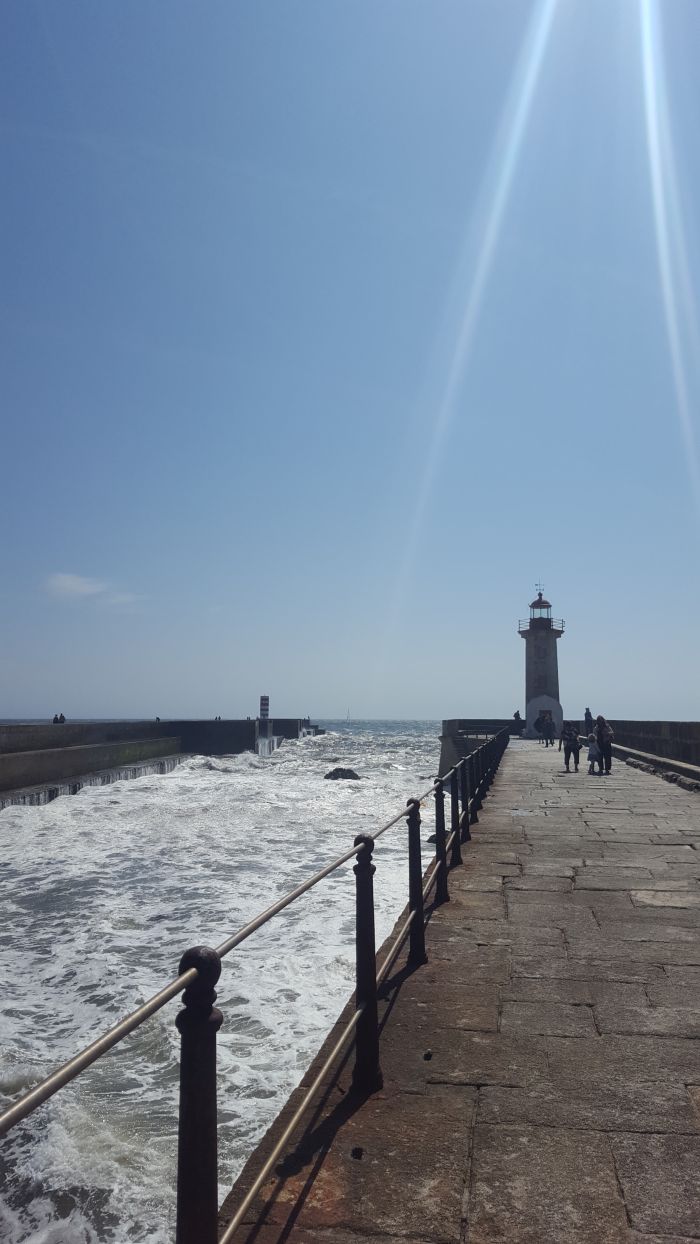 În ziua a șasea, ultima, oceanul se arată albastru. Vântul bate cu putere, atât de rece în sulițele lui că-mi clănțăne dinții în gură. Pălăria o ia razna, alerg după ea până-mi dau seama că n-am nicio șansă și, cu orice risc, o îndes în rucsac, lângă sticlele de apă și crema de protecție solară 50, convinsă fiind că va lua, la repurtare, ca întotdeauna, forma capului meu. Ajungem pe dig. Foz do Douro. Nu până la far, ne oprim cam pe la jumătatea distanței. Valurile sunt uriașe, iar noi, înfrigurați. Valurile se înalță cu zgomot peste dig, fotografii sar buimaci din calea lor. Valurile par năluci disperate. Către mal, formează vârtejuri de spumă. Timpanele, vibrând, mută accentul spre interior. Pescărușii se adună pe nisip, în preajma stâncilor. Începe să plouă mărunt.