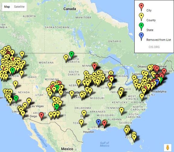 (Distribuția zonelor sanctuar în orașele (roșu), comitatele (galben) și statele (verde) americane. Se remarcă frecvența acestor zone în zonele de nordest și vest ale țării.