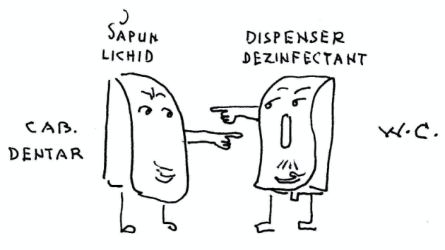 Ajunsă pe culoar, bag mâna sub stația automată de dezinfectare, de unde a curs o spumă albă. M-am frecat cu ea pe mâini și am devenit lipicioasă. Văzusem la un supermarket că, alături de dezinfectante, aveau și hârtie, aici nu era. Am încercat și alt distribuitor, efectul – identic. Citesc eticheta: Săpun pentru spălat pe mâini. E clar, persoana care montase distribuitoarele, în loc să le pună la toaletă, le-a montat pe culoare.
