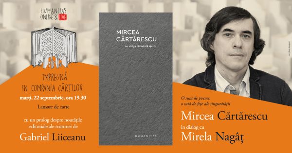Marți, 22 septembrie, de la ora 19.30, editura Humanitas invită cititorii săi la o întâlnire online&live cu Mircea Cărtărescu și Mirela Nagâț despre cele „o sută de poeme, o sută de fețe ale singurătății“ din volumul Nu striga niciodată ajutor. În deschiderea serii, Gabriel Liiceanu va prezenta noutățile editoriale ale toamnei.