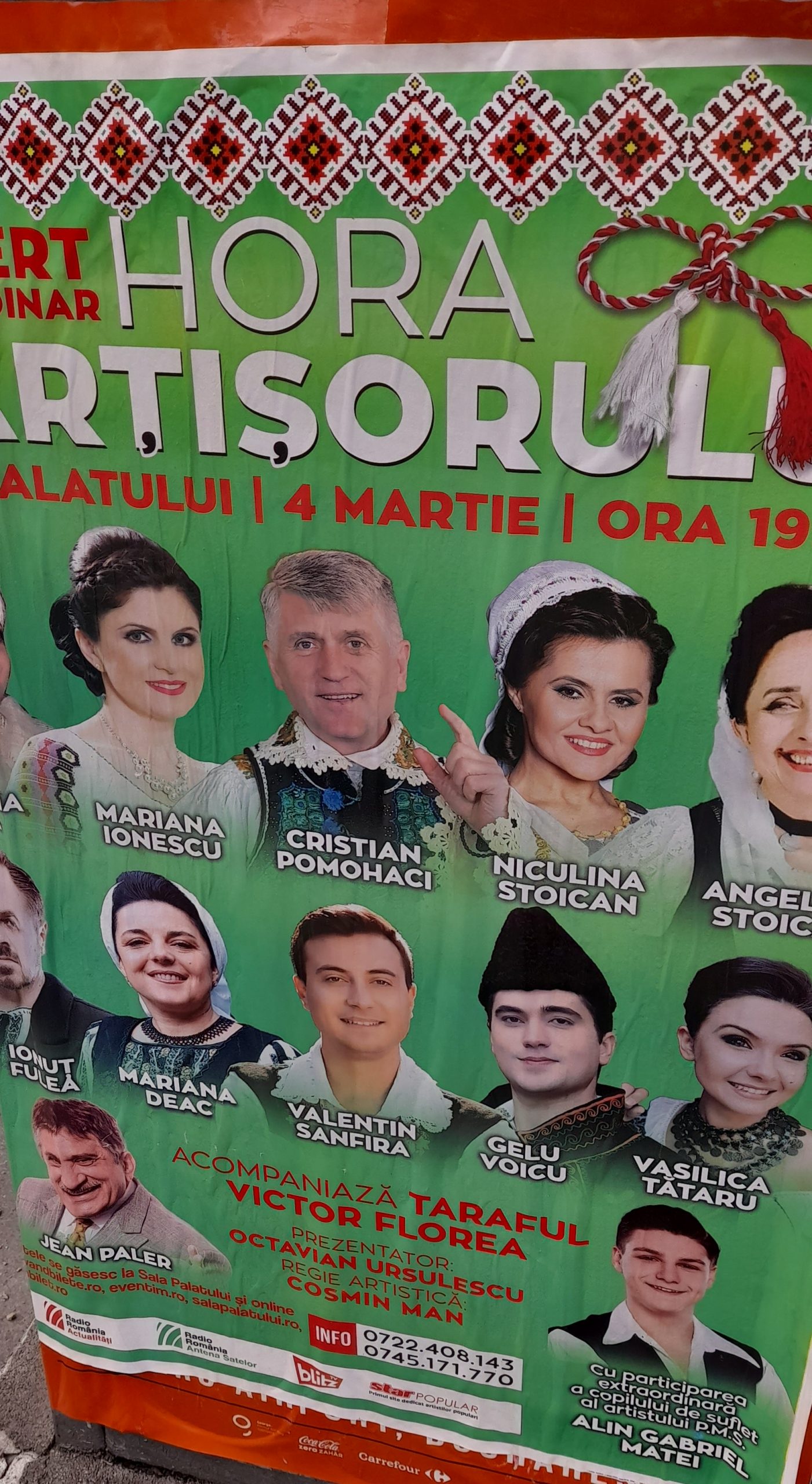 ar alese civilizări civice este, de-altminteri, inevitabil. Bunul simț național, ghidușul duh sfânt care animă vigil orișice român neaoș, deja lucrează. Iată, în afișul atât de bine ornat și frumos colorat, pozat și oferit admirației publice inclusiv iciișa, zorile emancipărilor desăvârșite își arată fin fața. Prin cântec, joc și voie bună, atotiubitorul spirit menit a uni om cu persoană fără nicio deosebire precis-precis se va insinua, va penetra, avansa-va. În iertarea atât de firesc-umană (nu doar divină), cu care poporul înghite, spală, văruie, cadorisește și repede uită abuzurile, ateismul, arghirofilia și infamia atâtor de mulți popi, vedete și demnitari, iată că total reabilitat și poliaplaudat cântă și juisează pe scenele patriei inclusiv dragul de maestru al nostru al tuturora, șarmantul gurist răspopit Cristian Pomohaci. Care mai este (admirați poza) și singurul ins ce ne-arată și promite ceva de taină cu blagoslovitoarea și binefăcătoarea-i mânuță (fie ea stângă, totuși vivantă, scoțând degețele stilate din poanieu dantelat). Taman în fruncea de centru al tuturor celorlalte populare gurițe fardate/rujate, caremaidecare cu marame ori căciuli (sau fără), bașca-n jos de trotuar „Cu participarea extraordinară a copilului de suflet al artistului…” (nu se spune-n clar care, însă după acoperitele majuscule știe precis orice sereii de filaj stradal).