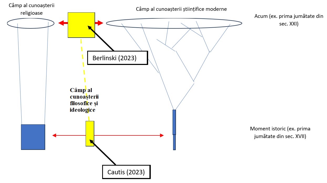 În figura de mai jos avem situația celor două lucrări amintite la începutul acestui text. Lucrarea Cautis (2023) tratează relația dintre știință și religie la nivelul de dezvoltare relevant secolului XVII, iar lucrarea Berlinksi (2023) se angajează în disputa ideologică derivată ateism-antiateism. Deși în titlurile ambelor se face referire la știință, niciuna dintre ele nu se referă la câmpul actual al științei, în starea sa din prima jumătate a începutului secolului XXI, ceea ce poate induce unui cititor neavizat, de exemplu studentelor și studenților în științe și teologie aflați la început de drum intelectual, una dintre confuziile de mai sus. De aceea, este important să contextualizăm contribuțiile respective și, în general, orice contribuție la dezvoltarea acestor domenii foarte complexe aflate în strânsă relație filosofică și ideologică.
